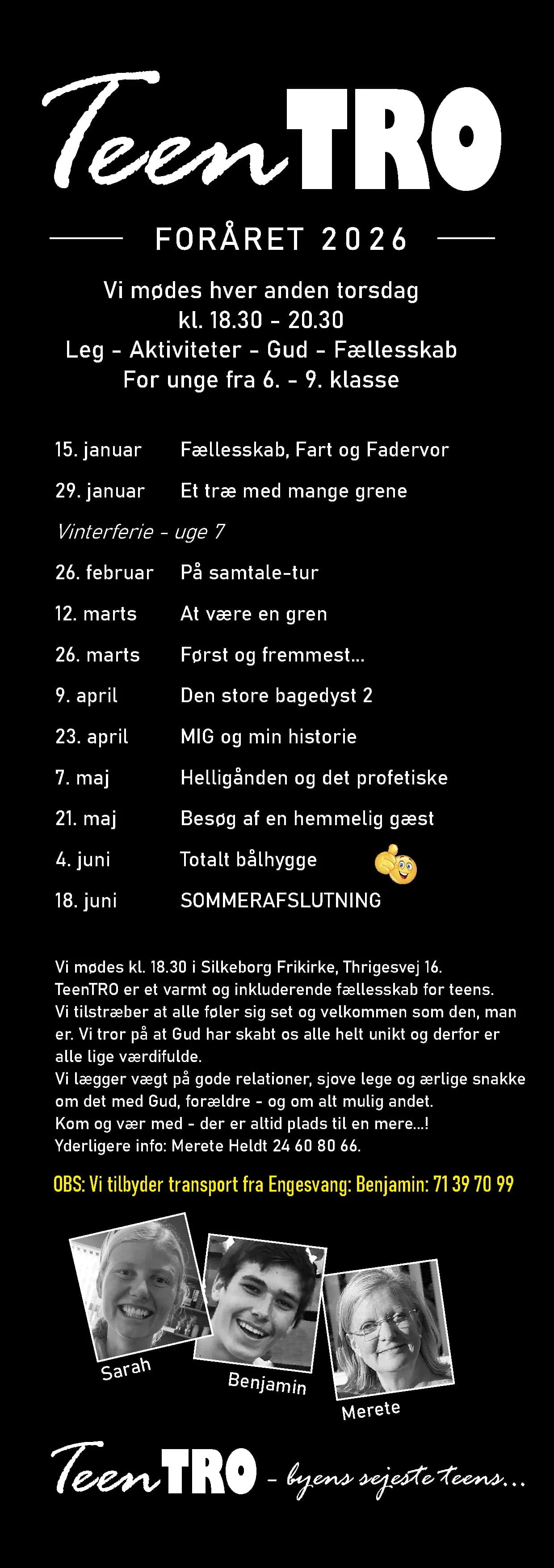 TeenTRO er kirkens klubtilbud for teenagere. Formålet er at skabe et fedt fællesskab for teens – ’med Gud i midten’. Vi lægger vægt på gode relationer, sjove lege og ærlige snakke om det med Gud. For unge i 6. - 9. klasse (12-16 år). Se programmet herunder.